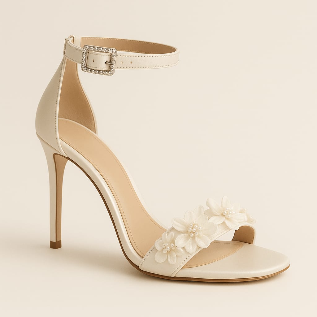 Şık beyaz parlak deri ile kaplı bu topuklu sandalet, 10 cm’lik ince stiletto topuğu ve platform ön kısmı sayesinde zarif bir yükseklik sağlıyor. Ayak bileği etrafındaki ince kayış, küçük kristal tokalı tokasıyla güvenli oturuş sunarken, burun kısmındaki beyaz inci çiçekler feminen bir dokunuş katıyor. Düğün, nişan ve abiye kombinleri için ideal; her adımda şıklık ve konfor bir arada.